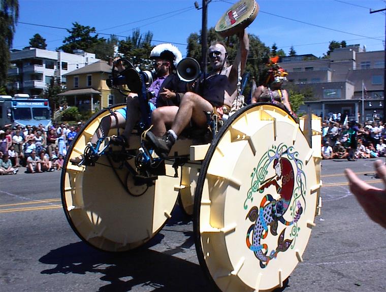 Finally, here's the parade itself. There were no motorized floats allowed, so everything was somehow human powered. These guys put together a massive 4-man bicycle.