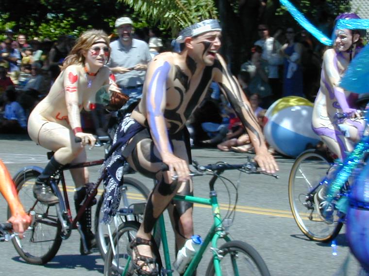 Finally we got our spot along the parade route. An unofficial tradition of the Fremont fair is for naked people on bikes to zip around the parade route right before the more official floats. Check them out!