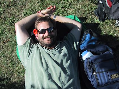 | Eric and I juggling | | We took some breaks as well. I put this flower in Eric's sunglasses. Cute! |