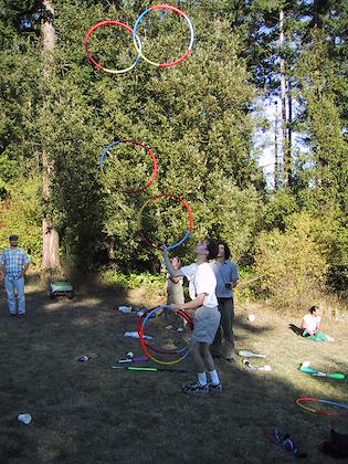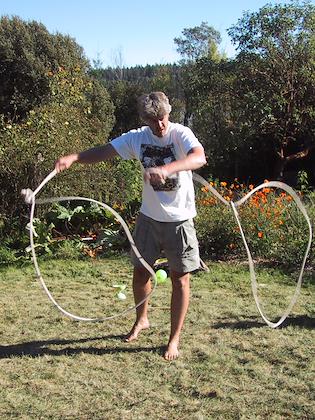| This is John, juggling 4 clubs. | | Ben, juggling 5 oversized rings |