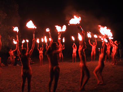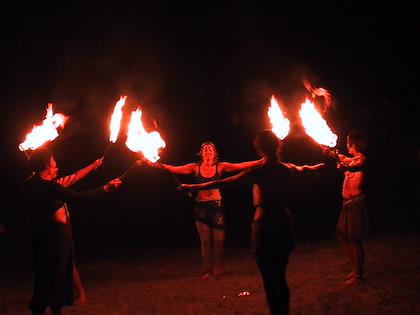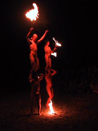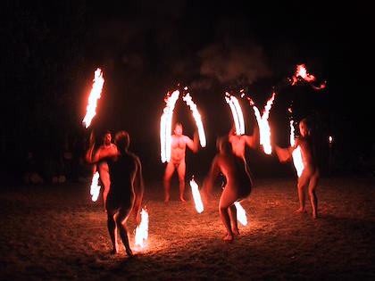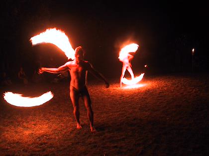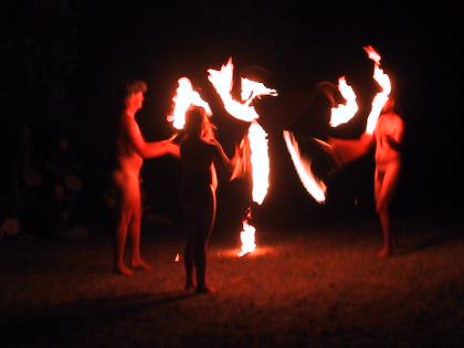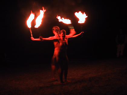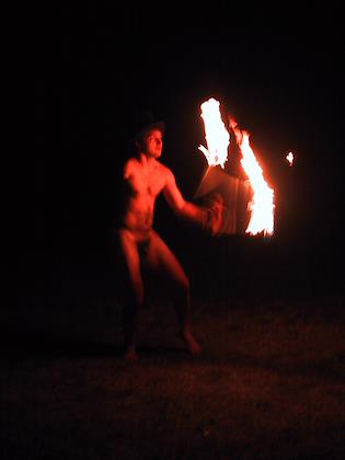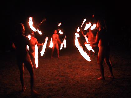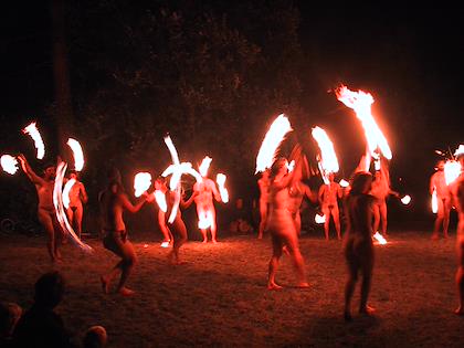 | Before dinner, we stood in a circle for the pre-meal ritual of singing. | | Around 9 that night, the NAKED FIRE JUGGLING began! The photos aren't that great...but Eric says "At least you can tell the boys from the girls!". At first there was a big group juggle of torches, then there were smaller acts. |