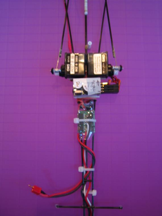 The servos and receiver are mounted on balsa which is tied down and CA'ed to the frame. This makes for a nice firm platform. I was afraid that the torque from the servos would stress the single rod fuselage mount. This is a much better and stronger.